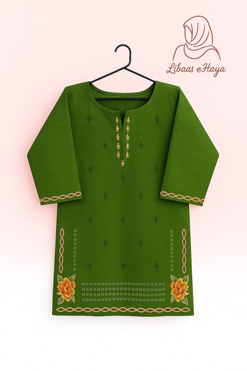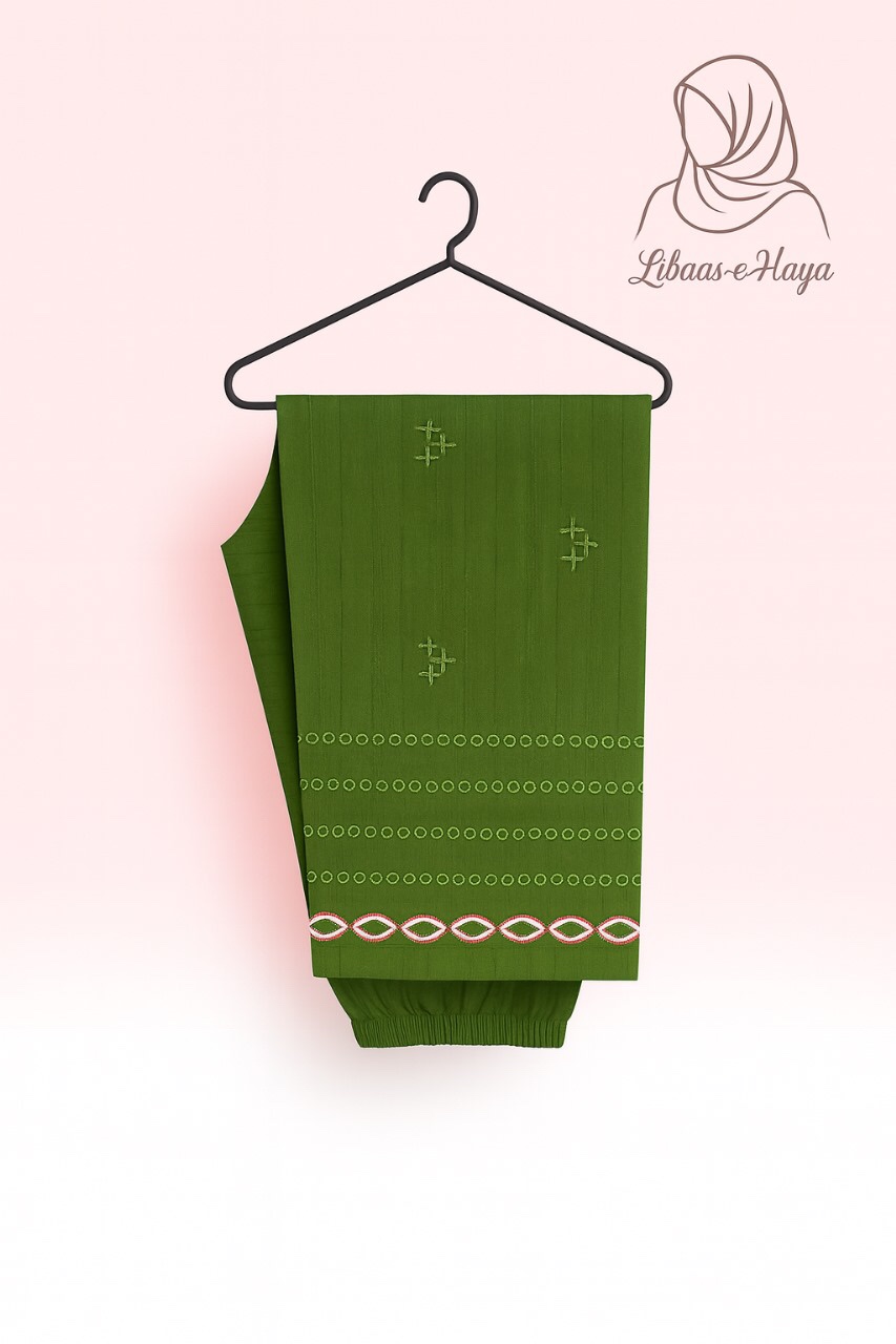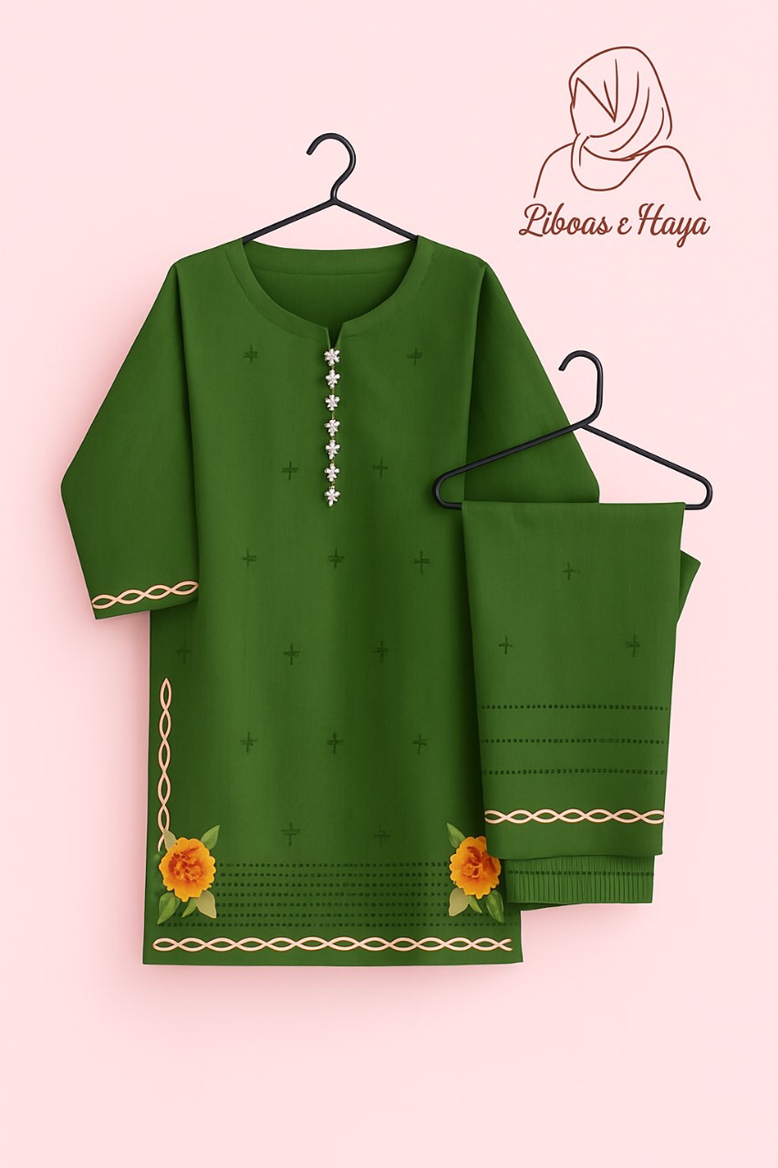 Libaas-e-Haya Green Cotton Embroidered Two-Piece – Crafted in a refreshing green shade with fine embroidery, this cotton set offers breathable comfort and everyday sophistication.
