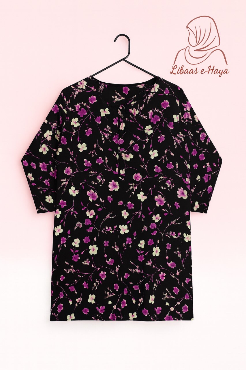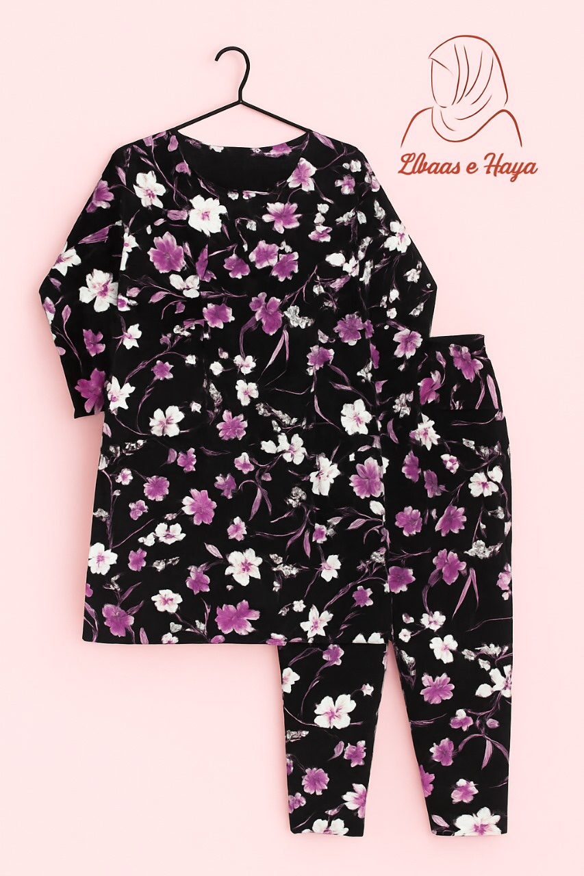 Color: Black base with Purple & White Floral Bring elegance to your wardrobe with this Black Lilan Suit, beautifully adorned with purple and white floral prints. Crafted from soft and breathable Lilan fabric, this 2-piece set (shirt + trouser) is perfect for both casual and semi-formal wear, keeping you stylish yet comfortable.