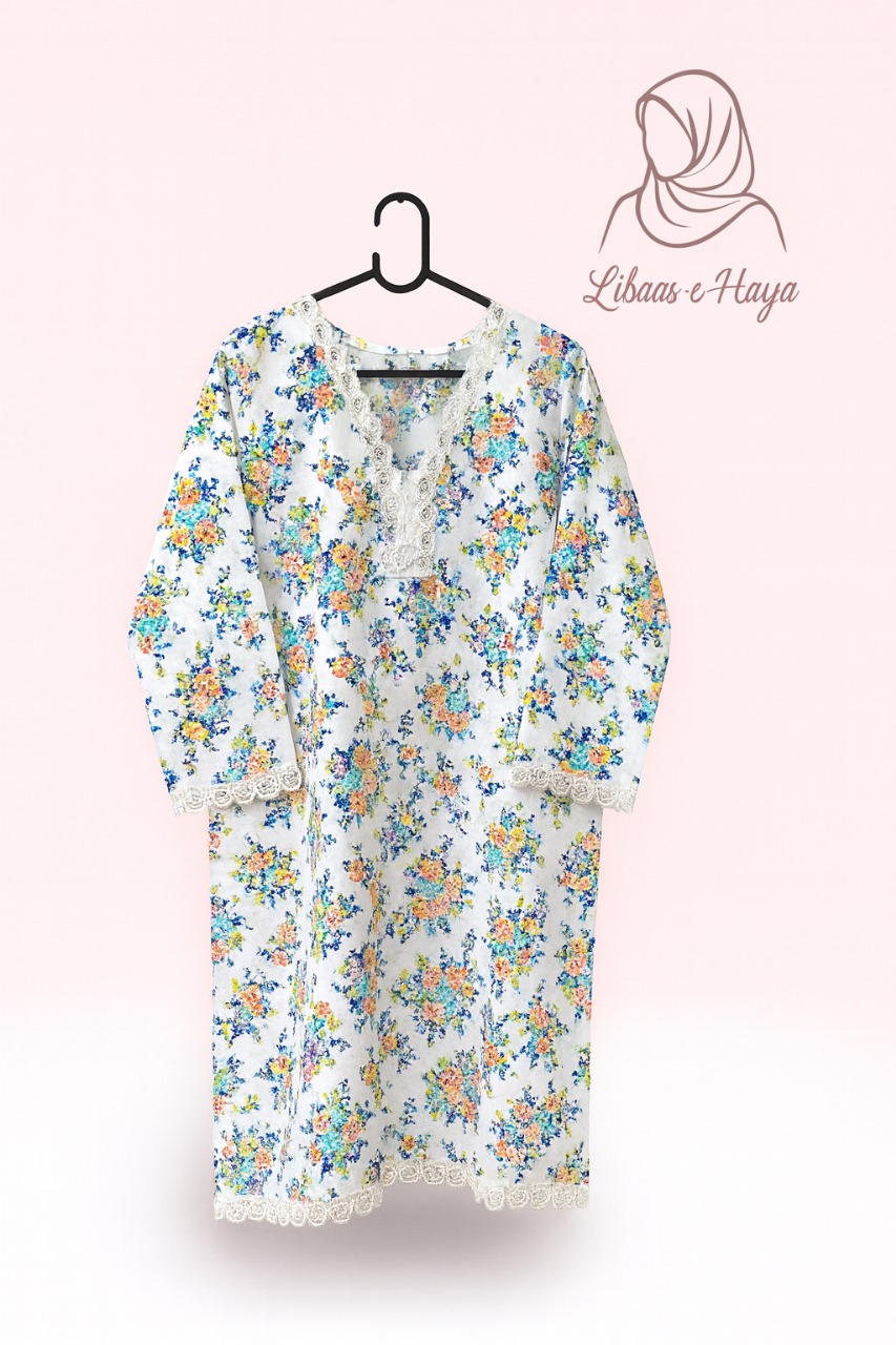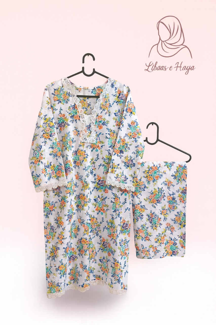 Libaas-e-Haya White Floral Lawn Two-Piece – A fresh summer look crafted in soft lawn fabric. Featuring a white base with vibrant multi-colored floral prints and lace detailing, this dress is designed for breathability, elegance, and effortless style, perfect for everyday and casual wear.